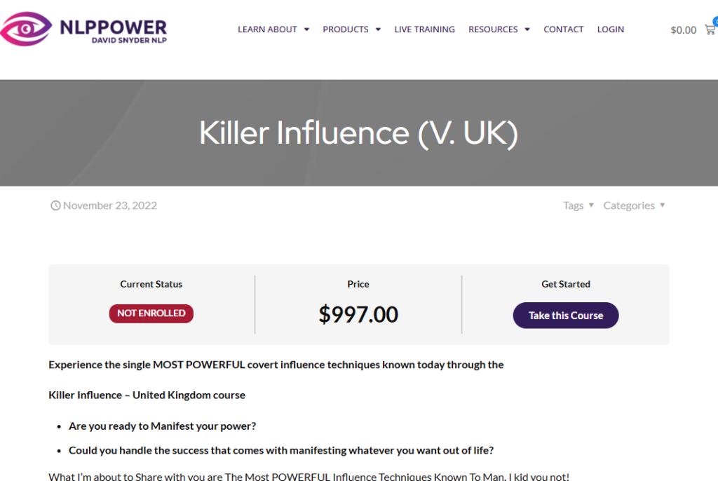 David Snyder – Killer Influence (v. UK – 2022) is more than a communication course—it is a deep dive into how influence truly works at the human level. By focusing on psychology, ethics, and real-world application, this training offers a long-term skill set that remains valuable across industries and life situations.